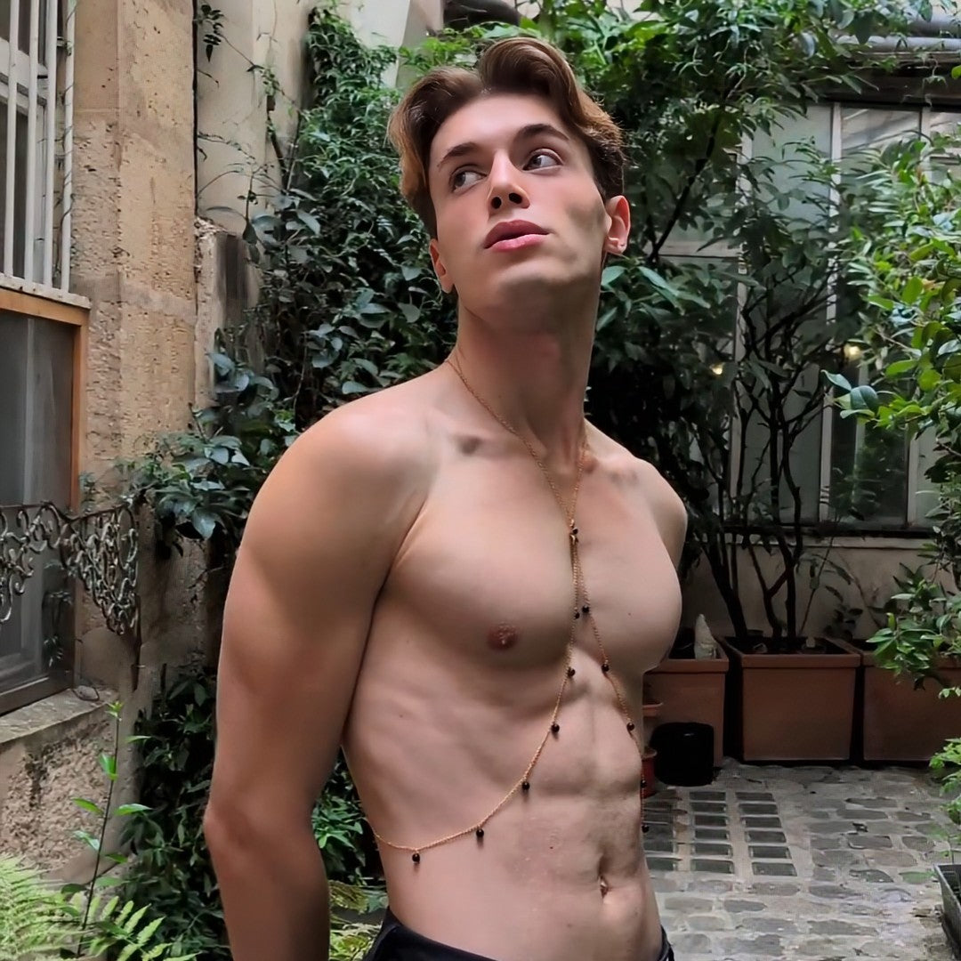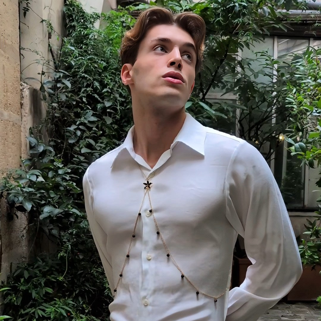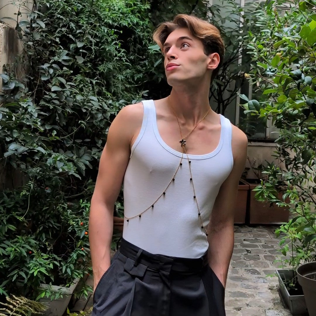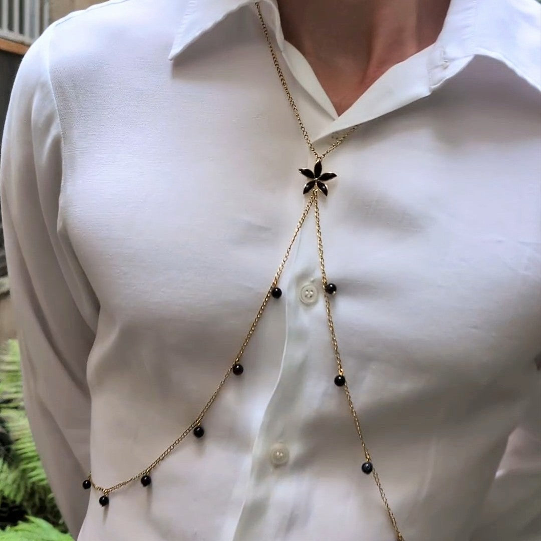 Styx est un bijou de corps sophistiqué orné de pierre fine en onyx (non teintées) et d'une fleur de sakura noire pour allier élégance, audace et sensualité. Ce parement corporel fait main s'ajuste facilement pour un confort optimal, sa conception est faite pour mettre votre corps en valeur et attirer les regards. Que vous le portiez sur la plage torse-nu, de façon décontracté sur un t-shirt ou de façon plus sophistiqué sur une chemise, il fera toujours son effet.